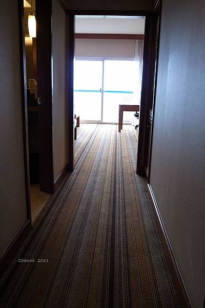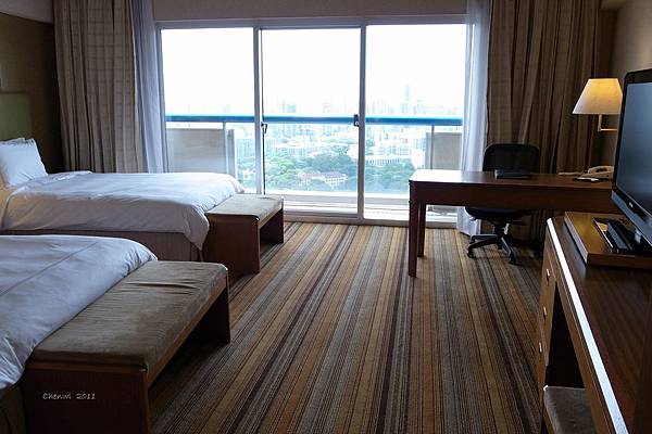 第一眼看到的是,直條紋的厚地毯,潔白的床單,氣派的木頭書桌跟電視梳妝台,感覺挺大器的~ 不過更大器的是高樓層的窗外景色