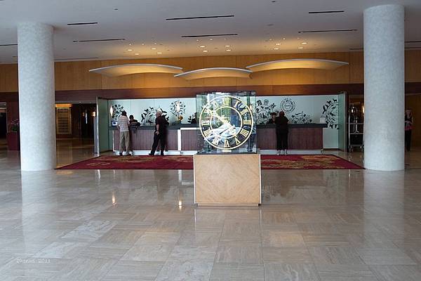 首先,房客幾乎都是西方人; 然後是大廳旁邊站著幾位身穿棗紅色長旗袍盤著一頭烏黑秀髮又畫著濃裝的女服務人員,不過她們並不是櫃檯人員,櫃台人員是穿黑色套裝的,當傻博士跟一個日本籍的櫃檯人員辦check-in時,我一直觀察著這些穿長旗袍的女服務員,還是沒搞清楚她們的作用,她們大概就是跟那些西方客人的老婆小孩聊聊天而已! 然後還有有很多位推金色行李推車的中年行李服務生.