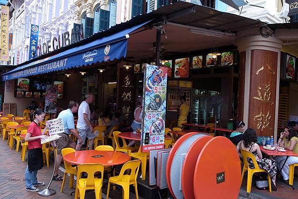 沿著這排餐桌椅走到底,來到了South Bridge Rd.後左轉,就可以遇到馬里安曼興都廟(Sir Mariamman Temple),廟外面遊客非常多,很多人特地像我一樣跑到對街拍照,