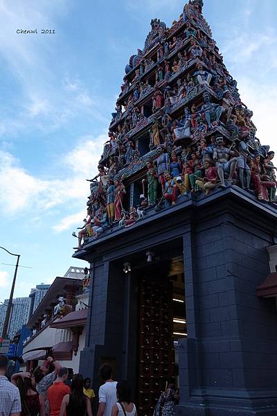 廟門入口的上方有一座立體樓塔,立體的印度神明雕像或坐或站,顏色鮮豔分明,非常細緻繁複,是標準的南印度廟建築風格. 這座廟是新加坡最老的興都廟(印度廟),裡面供奉的馬里安曼女神,是專門驅逐霍亂等傳染病的神祇,每年十月這裡都會舉辦盛大的蹈火節(Theemichi).